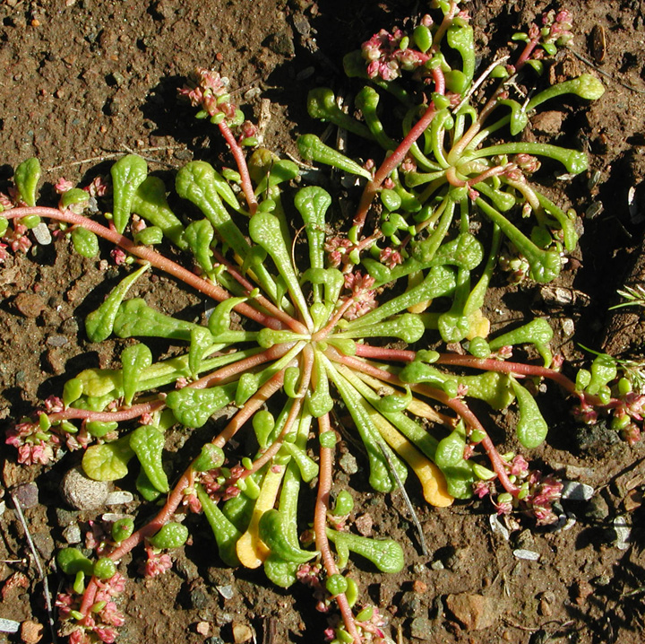 Small annual, somewhat succulent-stemmed herb, without hairs, taprooted. Stems branching from the base, lying flat on the ground (prostrate). Small, perfect, pink or white, 2 to 4 petaled flowers on short stalks along an elongated stem. Identification notes: Succulent stems lie on ground; leaves basal and on stems, widen towards their tips, basal withering in fruit; flowers small, pink or white, petals usually 3, styles absent, stigmas 2, on very short stems; fruit capsules >2 times as long as sepals. Height: